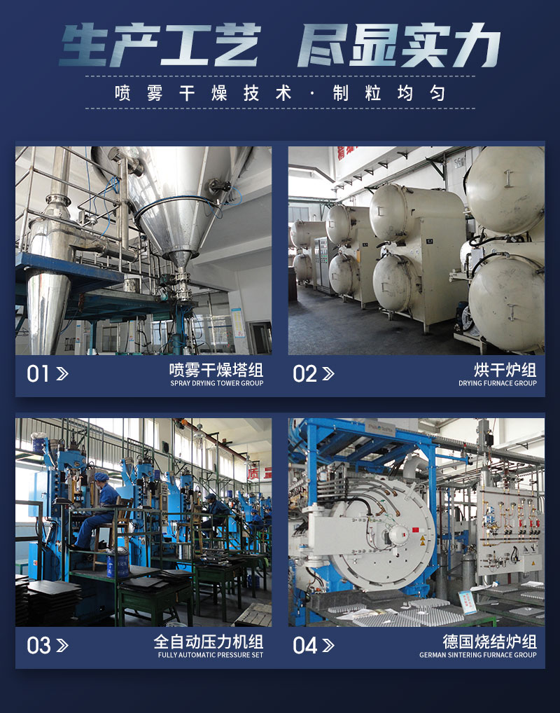 2、采用最新100MPa加壓燒結(jié)爐燒結(jié),在最后階段采用壓力燒結(jié),致密性得到了大的提高,孔隙度減少,大大地提高了產(chǎn)品的機(jī)械性能,沖擊韌性優(yōu)越,不掉塊、 沖擊次數(shù)同比提高更多。